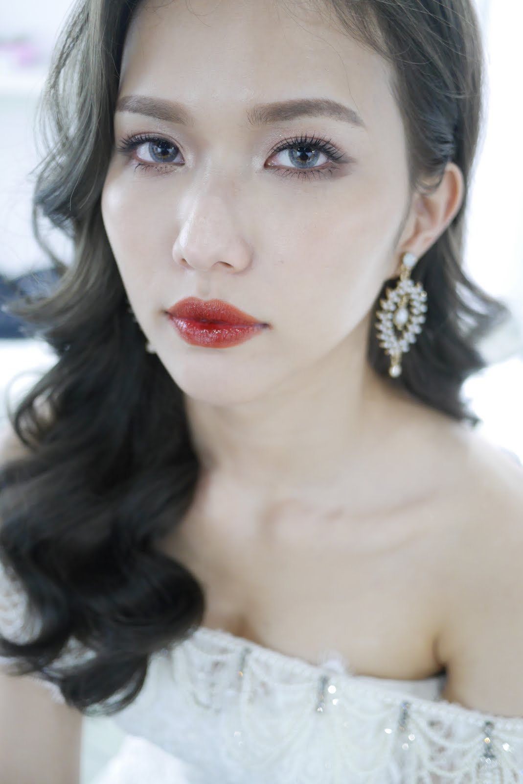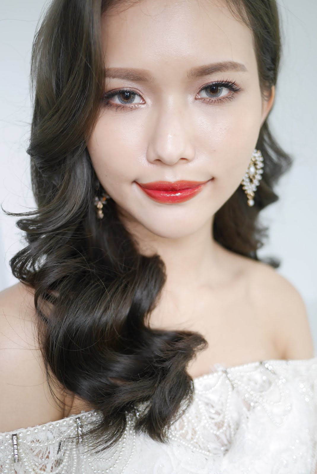 深色側分波浪長髮+時尚紅唇色+側邊的長耳環+小露香肩