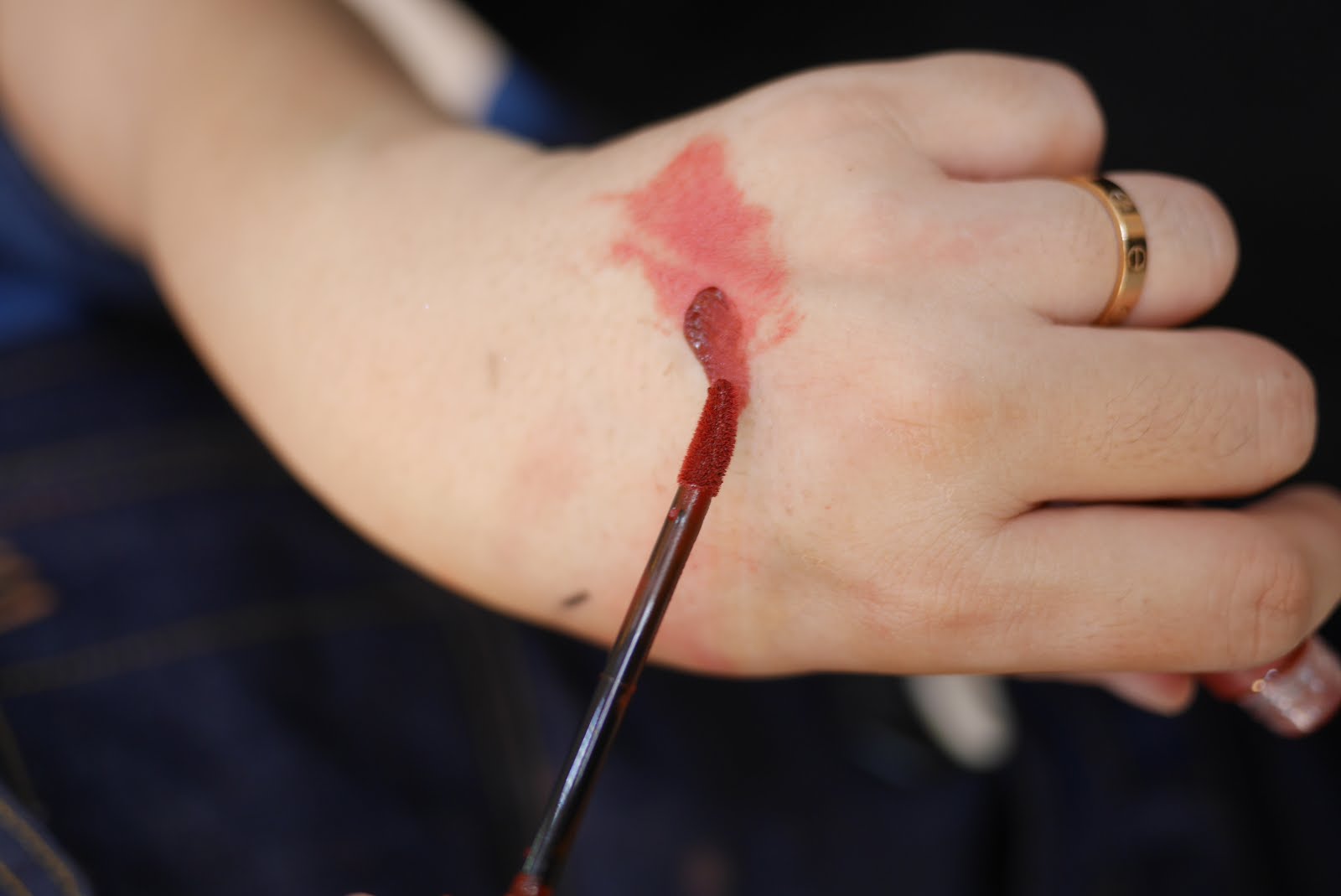 我選擇自然磚紅色唇釉來打底唇色先